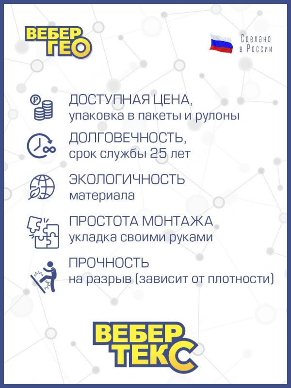 Геотекстиль Вебер.Текс "Садовый" 100 г/м2 - это нетканый иглопробивной материал, который производится из полиэфира высочайшего качества. Материал имеет высокие дренирующие, армирующие, разделяющие свойства.