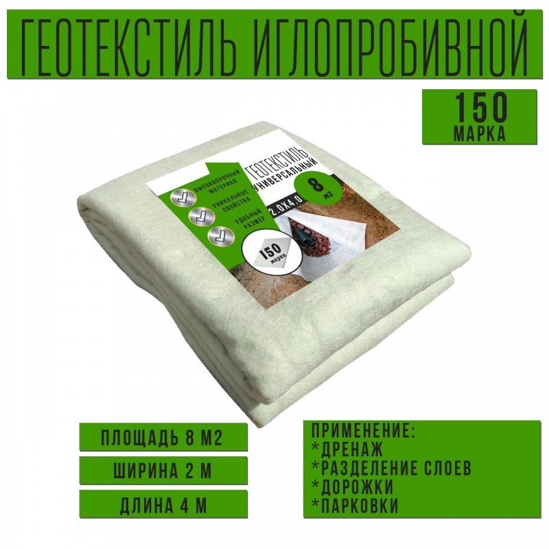 Геотекстиль Вебер.Текс марка 150, свернут в конверт, упакован в пакет. Размер упакованного полотна ширина 2 метра, длина 4 метров. Площадь покрытия 8 м2.