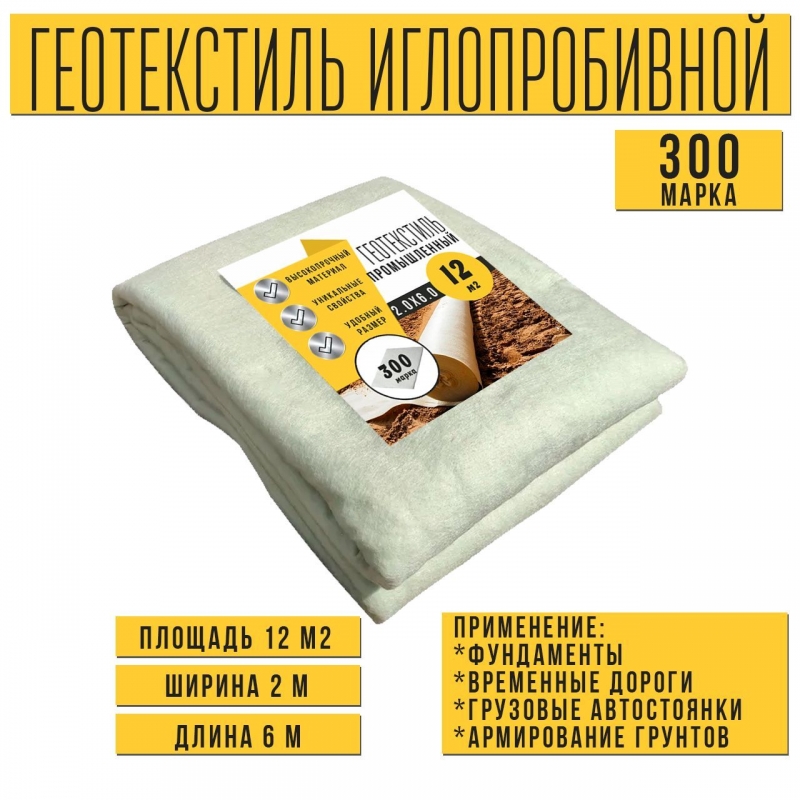 Геотекстиль Вебер.Текс марка 300, свернут в конверт, упакован в пакет. Размер упакованного полотна ширина 2 метра, длина 6 метров. Площадь покрытия 12 м2.