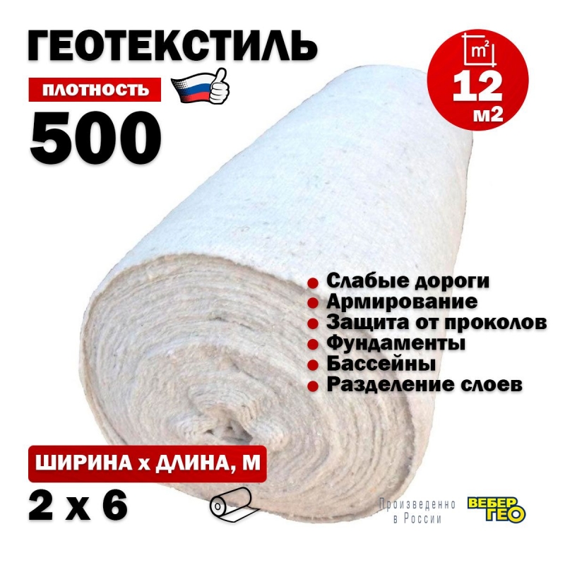 Геотекстиль Вебер.Текс марка 500, упакован в пакет. Размер пакета ширина 2 метра, длина 6 метров. Площадь покрытия 12 м2.