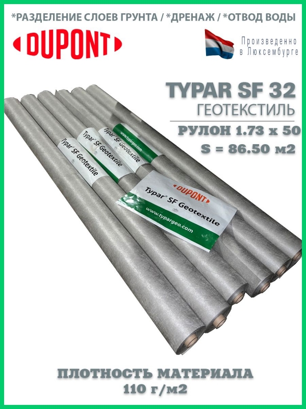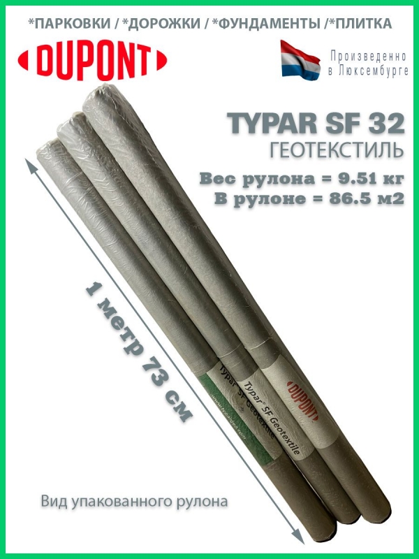 Материал упакован в рулон, этикетка с названием, термоскрепленный геотекстиль Typar SF 40 размером 1.73 м. х 10 п.м, общая покрываемая площадь 17.30 м2.